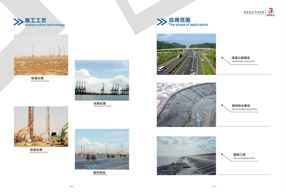 本公司專業(yè)生產(chǎn)“瑞建”牌塑料排水板系列產(chǎn)品,產(chǎn)品規(guī)格、型號(hào)齊全,能滿足各種軟土地基的加固處理等。產(chǎn)品質(zhì)量經(jīng)國(guó) 家權(quán)威機(jī)構(gòu)檢測(cè),各項(xiàng)指標(biāo)均超過(guò)國(guó)家標(biāo)準(zhǔn)和工程設(shè)計(jì)技術(shù)要求。質(zhì)量穩(wěn)定性和技術(shù)創(chuàng)新居國(guó)內(nèi)同行業(yè)首位;并通過(guò)省級(jí)技術(shù)成 果鑒定。產(chǎn)品銷往國(guó)內(nèi)各省市及國(guó)外,深受用戶的歡迎和好評(píng)。在多項(xiàng)重點(diǎn)工程中被建設(shè)單位(業(yè)主)評(píng)為指定產(chǎn)品。